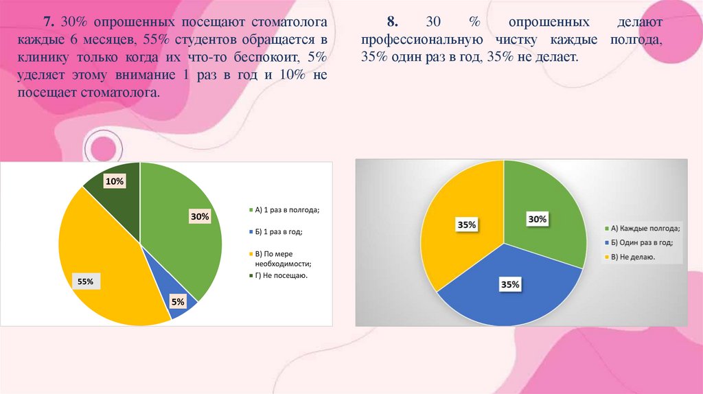 7. 30% опрошенных посещают стоматологакаждые 6 месяцев, 55% студентов обращается в