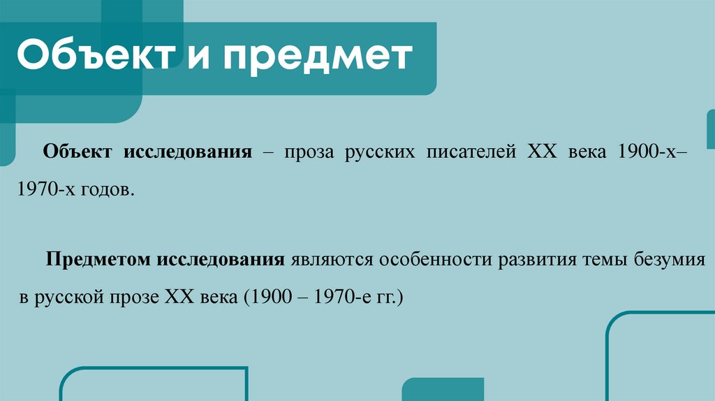 Объект и предметОбъект исследования – проза русских писателей XX века 1900-х–