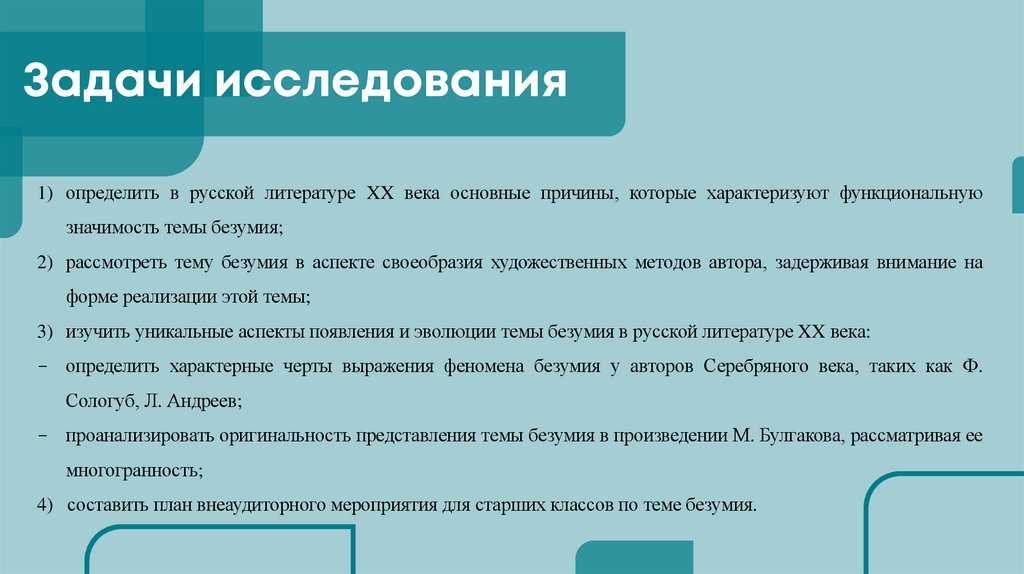 Задачи исследования1) определить в русской литературе XX века основные причины, которые характеризуют функциональную