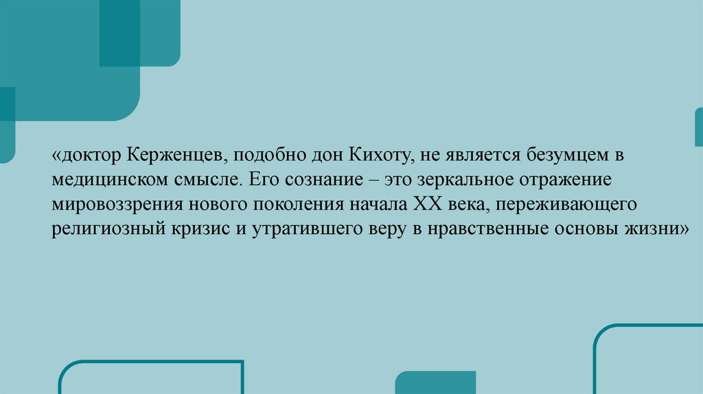 «доктор Керженцев, подобно дон Кихоту, не является безумцем вмедицинском смысле. Его сознание – это зеркальное отражение