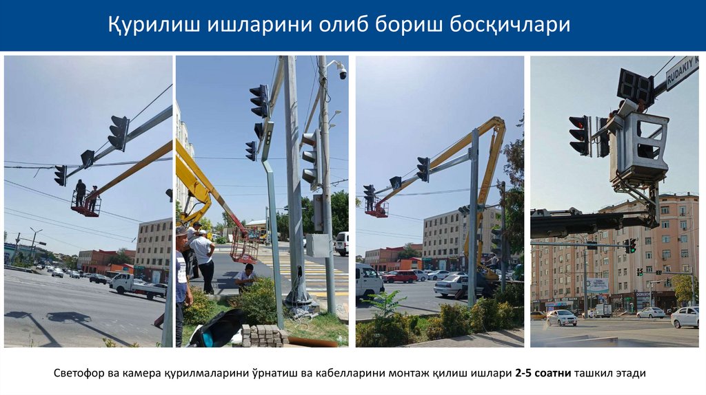 Қурилиш ишларини олиб бориш босқичлариСветофор ва камера қурилмаларини ўрнатиш ва кабелларини монтаж қилиш ишлари 2-5 соатни ташкил этади