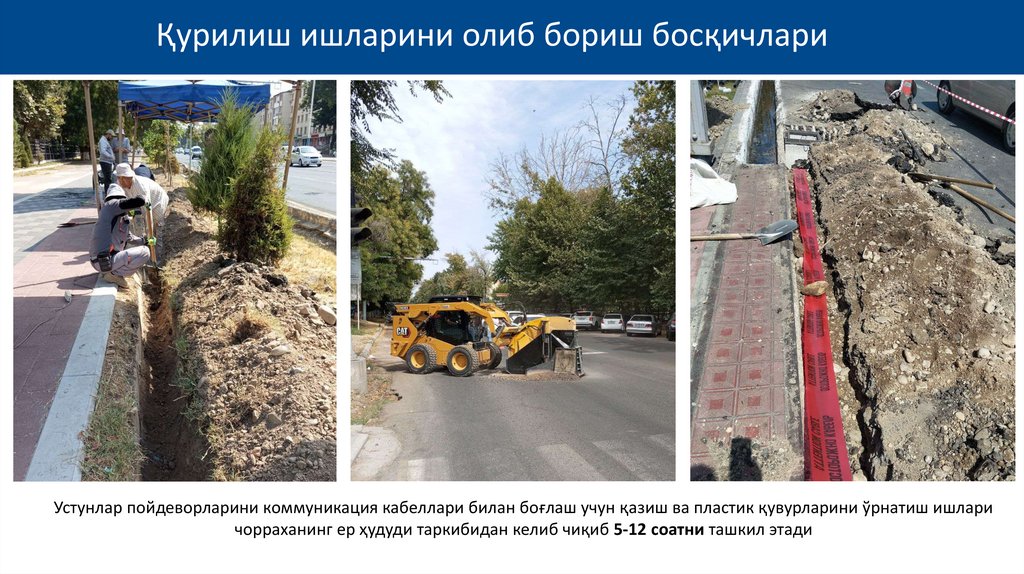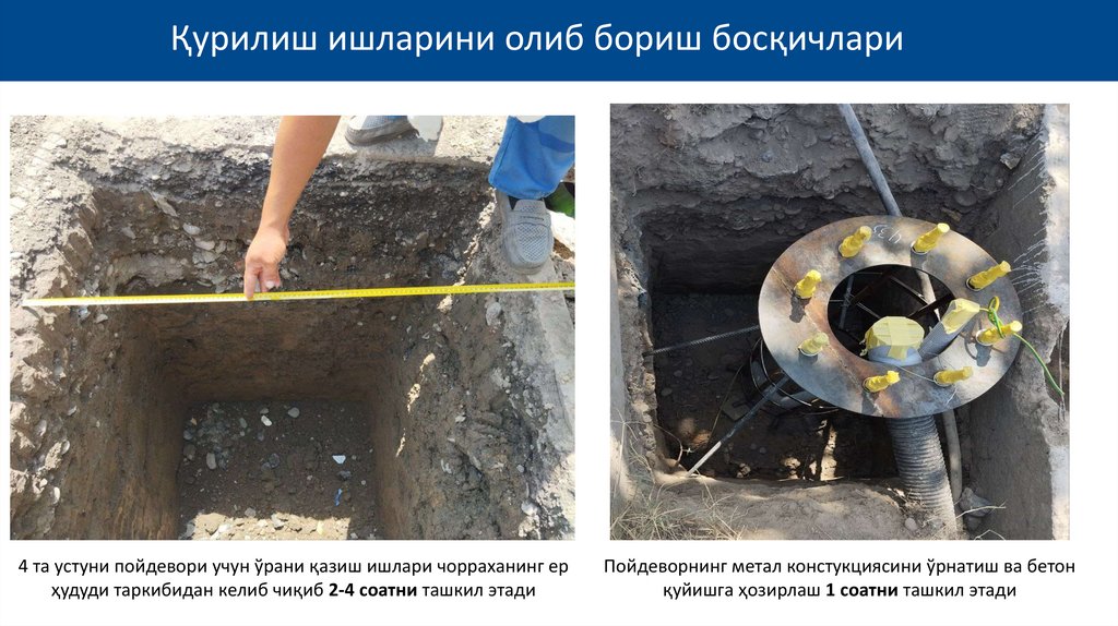 Қурилиш ишларини олиб бориш босқичлариУстунлар пойдеворларини коммуникация кабеллари билан боғлаш учун қазиш ва пластик қувурларини ўрнатиш ишлари