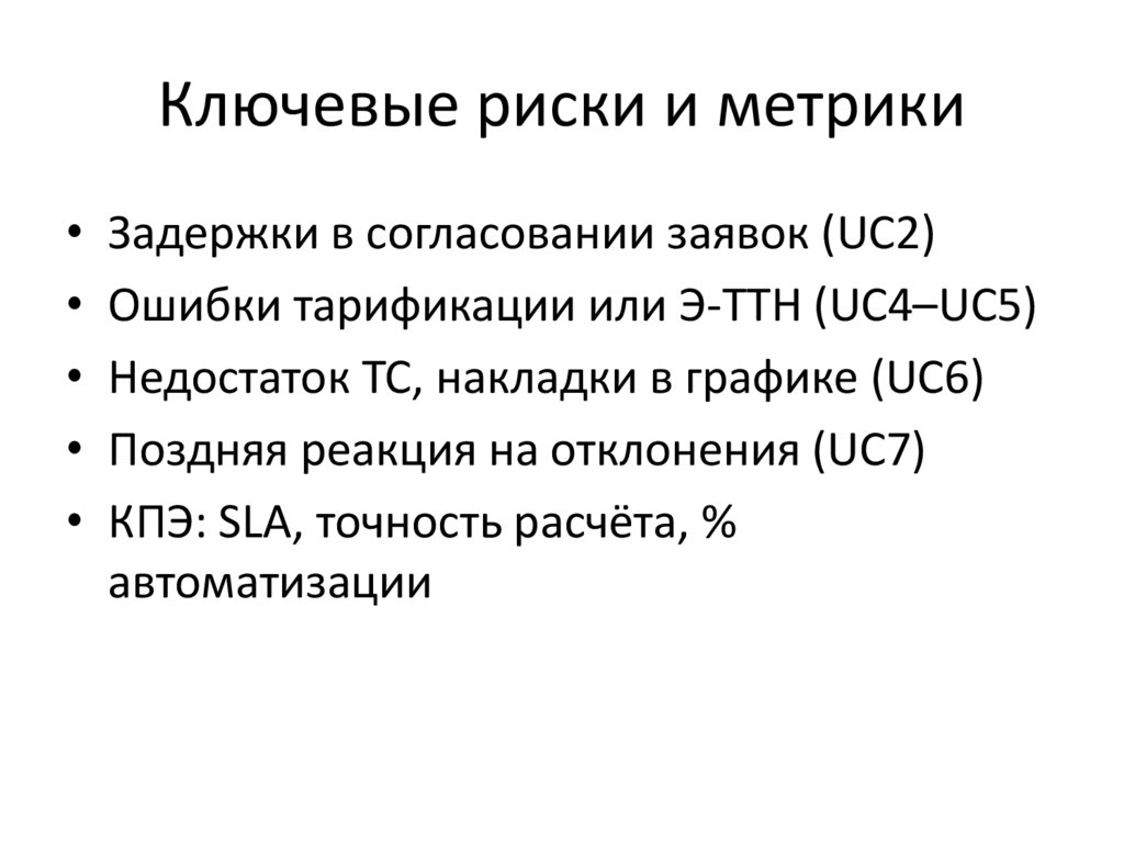Ключевые риски и метрики• Задержки в согласовании заявок (UC2)