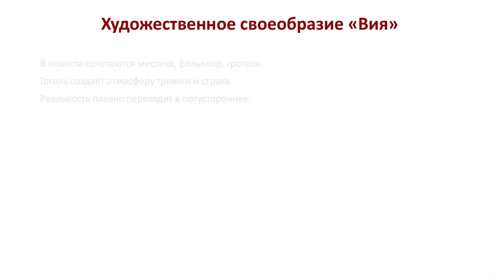 Художественное своеобразие «Вия»В повести сочетаются мистика, фольклор, гротеск.