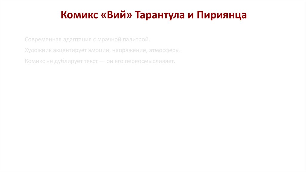 Комикс «Вий» Тарантула и ПириянцаСовременная адаптация с мрачной палитрой.