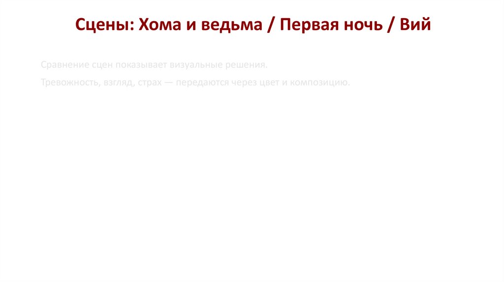 Сцены: Хома и ведьма / Первая ночь / ВийСравнение сцен показывает визуальные решения.
