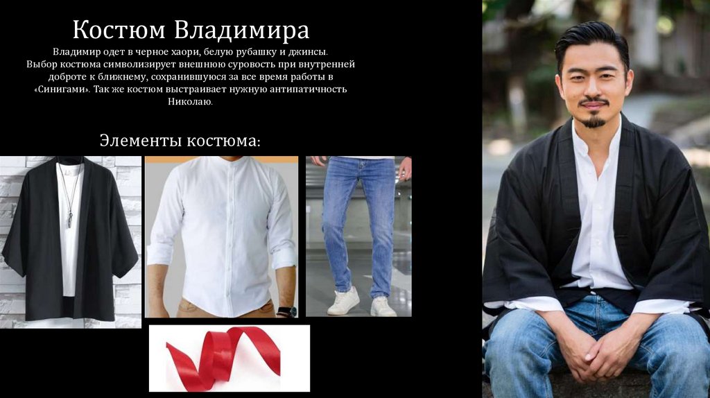 Костюм ВладимираВладимир одет в черное хаори, белую рубашку и джинсы.