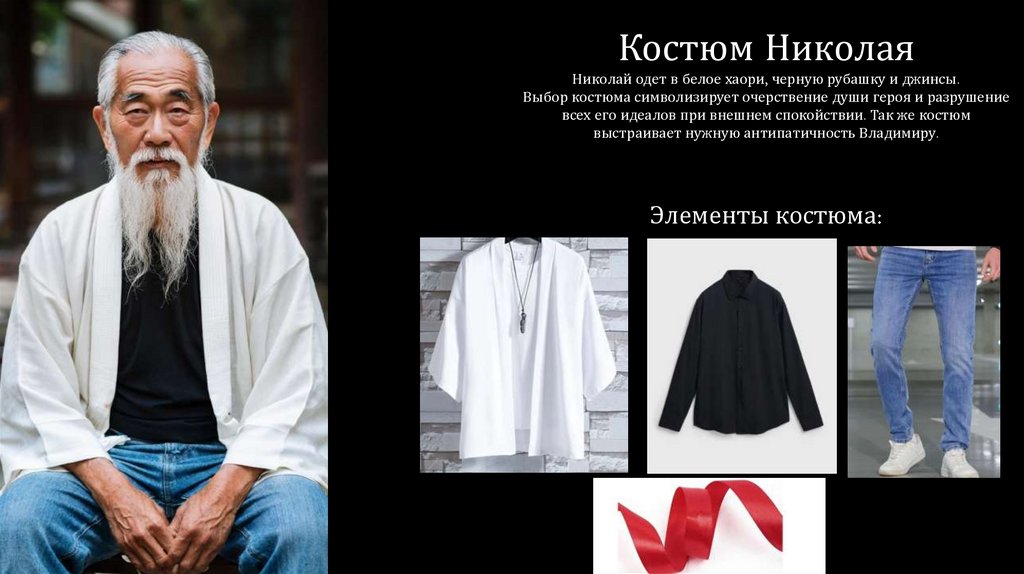 Костюм НиколаяНиколай одет в белое хаори, черную рубашку и джинсы.