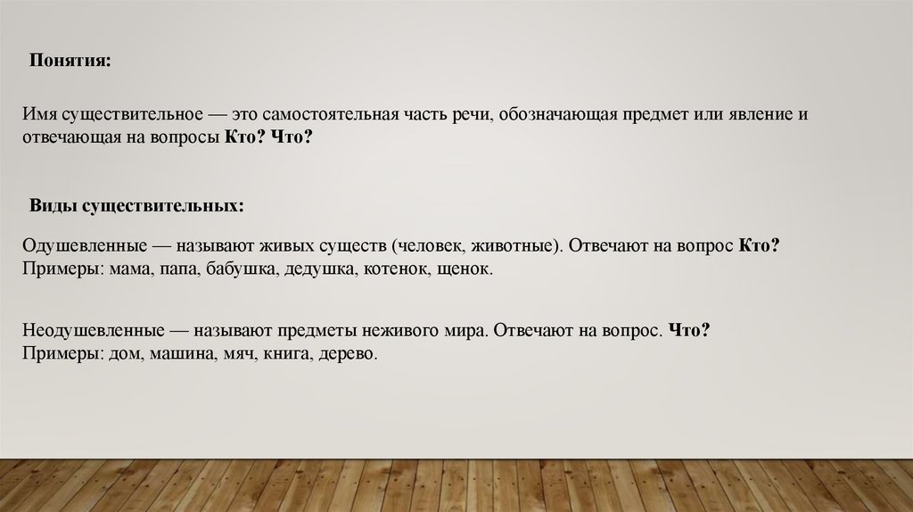 Понятия:Имя существительное — это самостоятельная часть речи, обозначающая предмет или явление и
