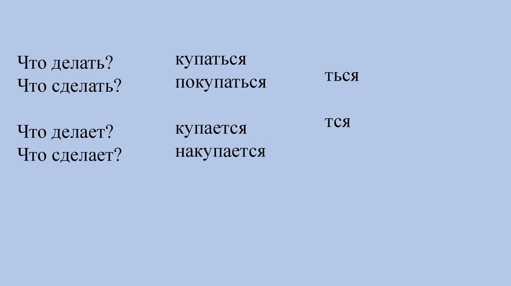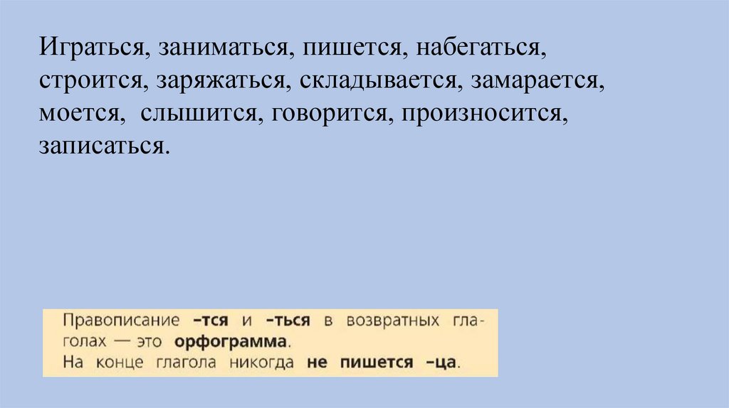 Играться, заниматься, пишется, набегаться,строится, заряжаться, складывается, замарается,