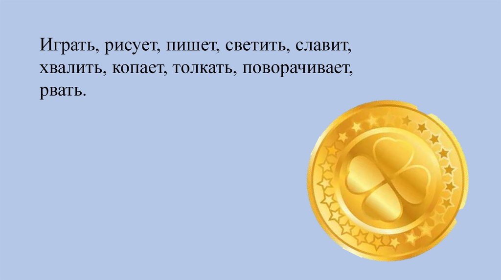 Играть, рисует, пишет, светить, славит,хвалить, копает, толкать, поворачивает,