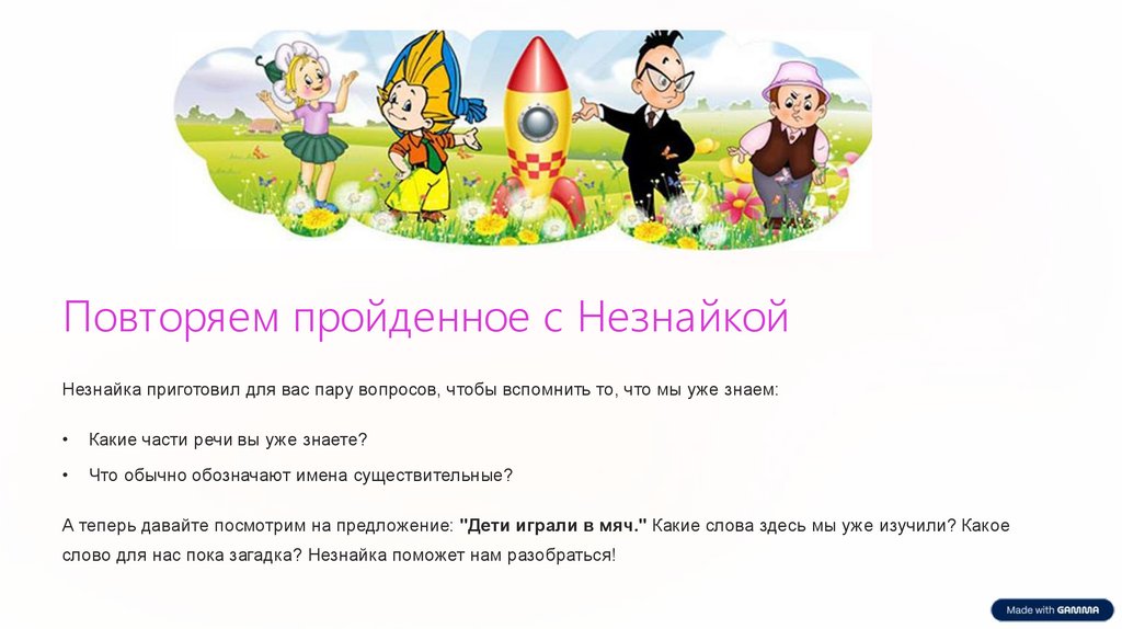 Повторяем пройденное с НезнайкойНезнайка приготовил для вас пару вопросов, чтобы вспомнить то, что мы уже знаем: