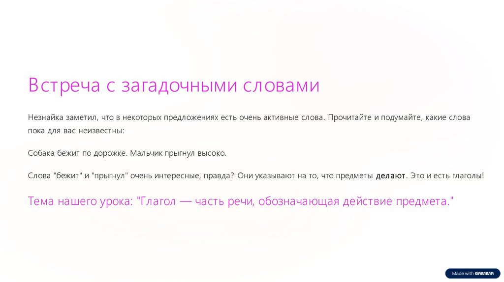 Слова "бежит" и "прыгнул" очень интересные, правда? Они указывают на то, что предметы дел ают. Это и есть глаголы!
