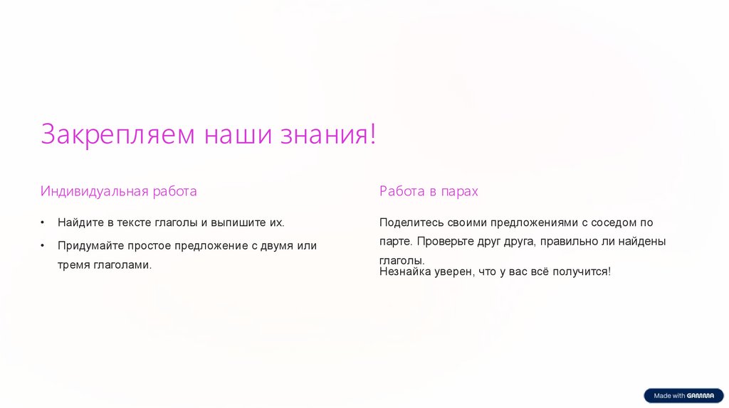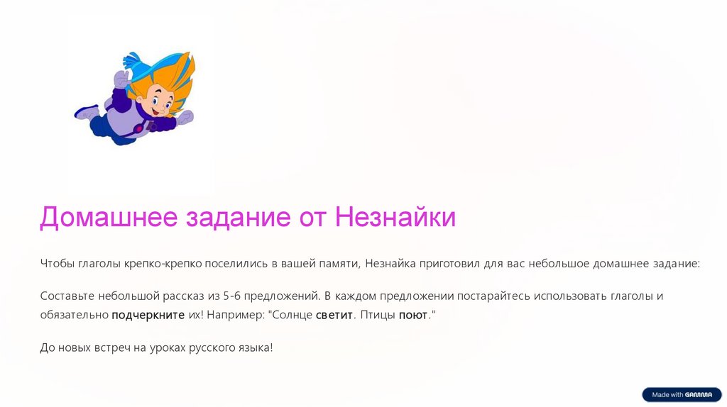 Домашнее задание от НезнайкиЧтобы глаголы крепко-крепко поселились в вашей памяти, Незнайка приготовил для вас небольшое домашнее задание: