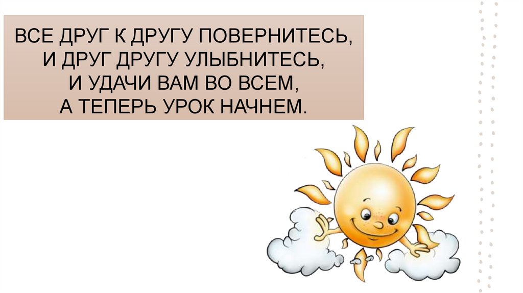 1. ВСЕ ДРУГ К ДРУГУ ПОВЕРНИТЕСЬ, И ДРУГ ДРУГУ УЛЫБНИТЕСЬ, И УДАЧИ ВАМ ВО ВСЕМ, А ТЕПЕРЬ УРОК НАЧНЕМ.
