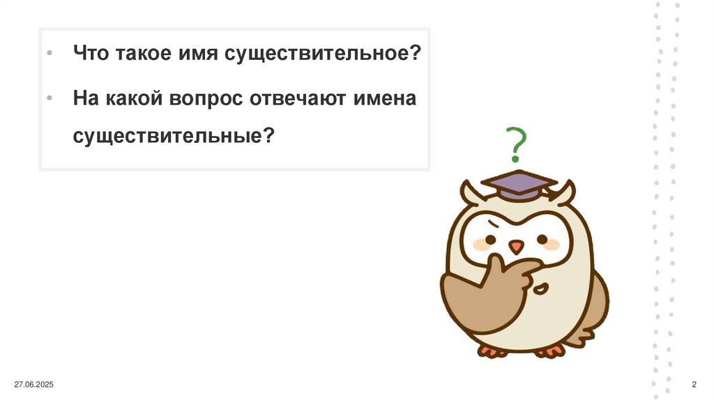 • Что такое имя существительное?• На какой вопрос отвечают имена