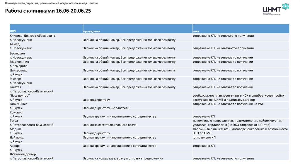 Коммерческая дирекция, региональный отдел, агенты и мед центрыРабота с клиниками 16.06-20.06.25