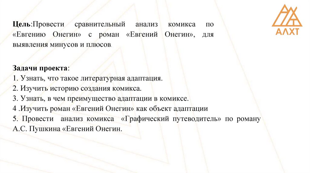 Цель:Провести сравнительный анализ комикса по«Евгению Онегин» с роман «Евгений Онегин», для