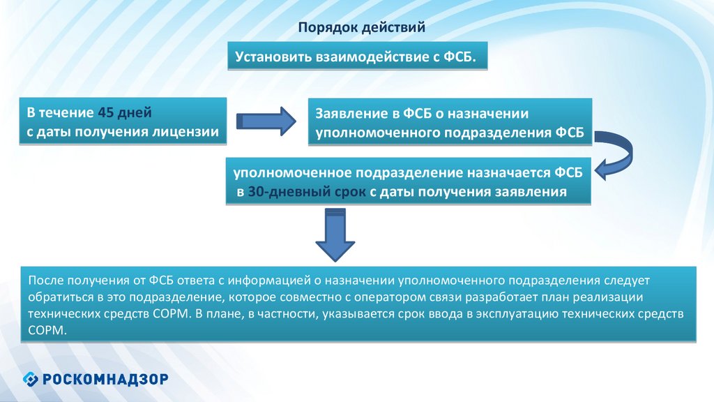 Порядок действийУстановить взаимодействие с ФСБ.