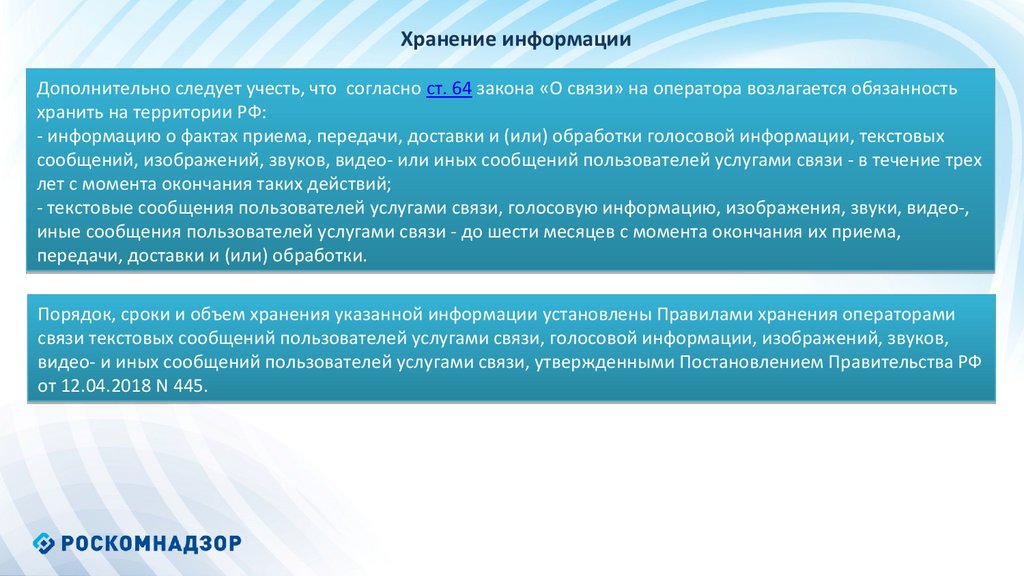 Хранение информацииДополнительно следует учесть, что согласно ст. 64 закона «О связи» на оператора возлагается обязанность