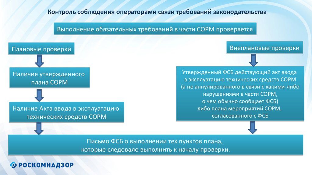 Контроль соблюдения операторами связи требований законодательстваВыполнение обязательных требований в части СОРМ проверяется