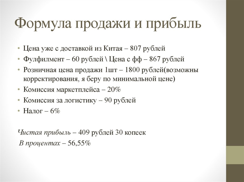 • Цена уже с доставкой из Китая – 807 рублей• Фулфилмент – 60 рублей \ Цена с фф – 867 рублей