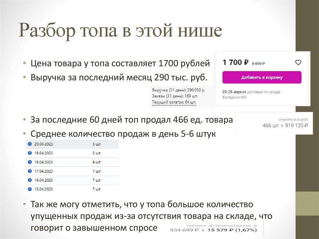 • Цена товара у топа составляет 1700 рублей• Выручка за последний месяц 290 тыс. руб.