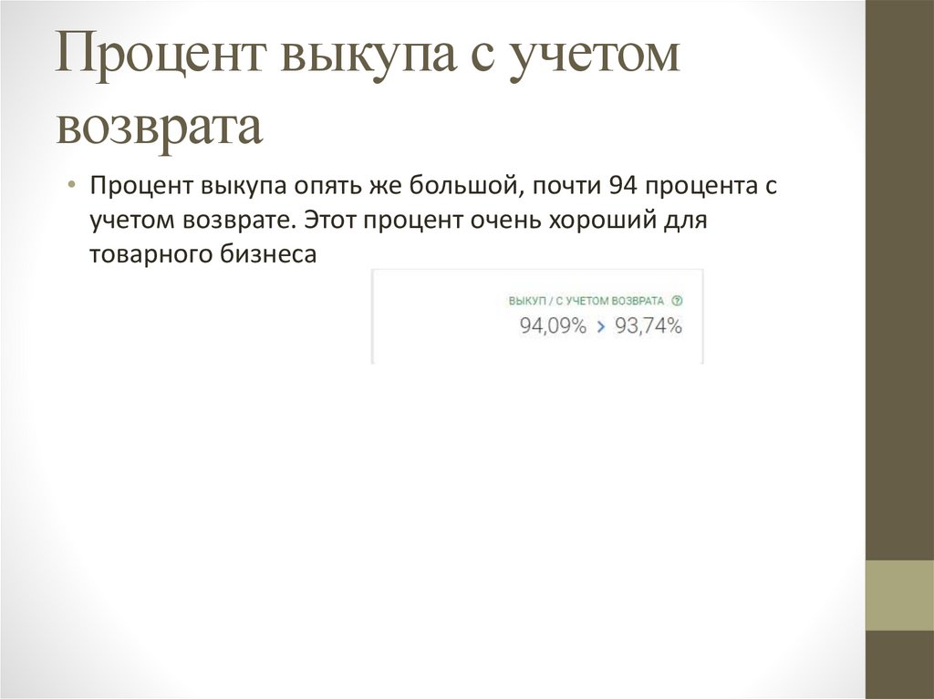 • Процент выкупа опять же большой, почти 94 процента сучетом возврате. Этот процент очень хороший для