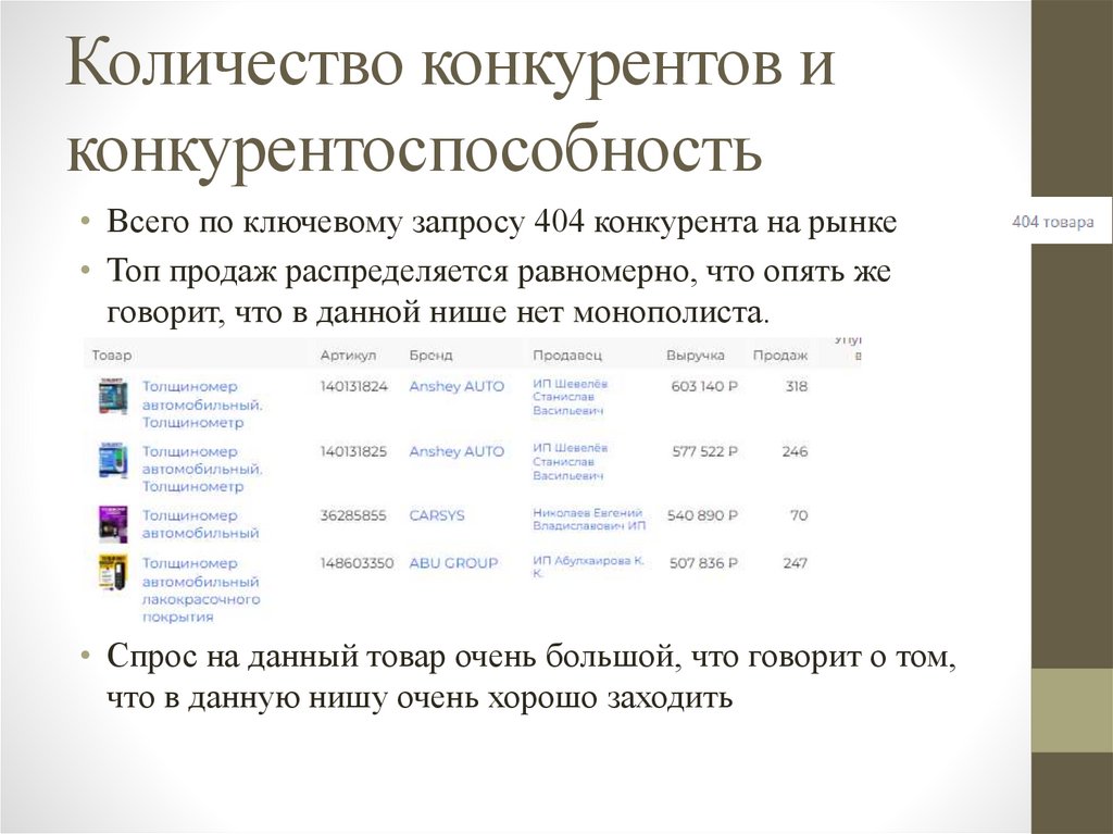 • Всего по ключевому запросу 404 конкурента на рынке• Топ продаж распределяется равномерно, что опять же