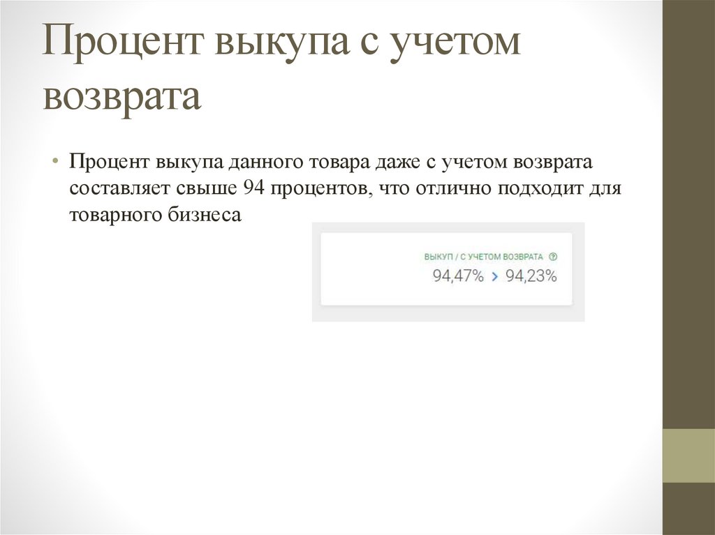 • Процент выкупа данного товара даже с учетом возвратасоставляет свыше 94 процентов, что отлично подходит для