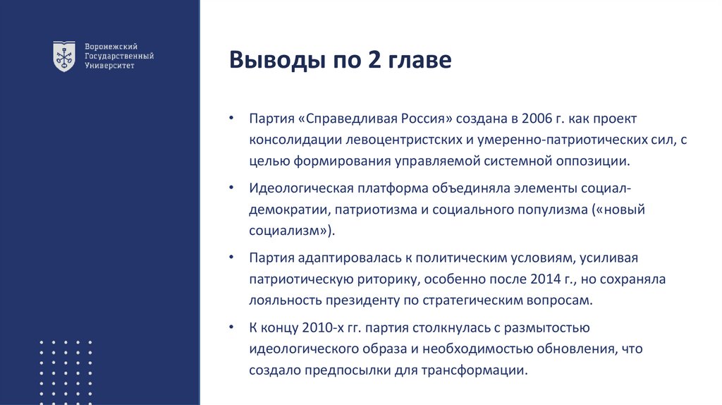 Выводы по 2 главе• Партия «Справедливая Россия» создана в 2006 г. как проект
