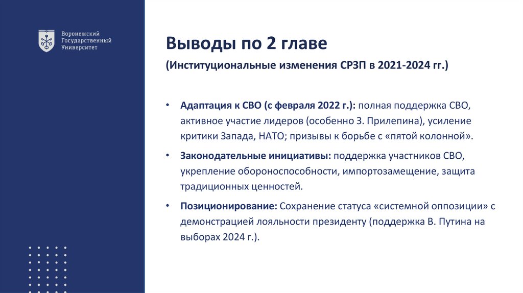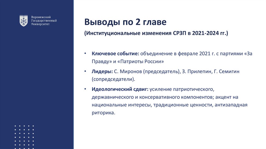 4. Институциональные изменения 2021-2024 гг. (ребрендинг, усилениепатриотической повестки) позволили партии адаптироваться к новой политической