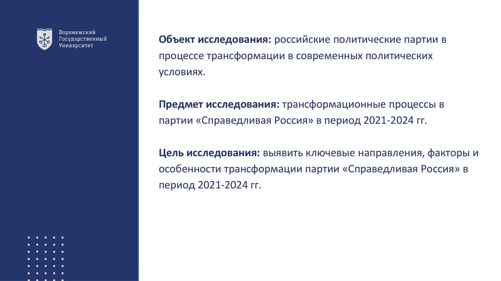 Объект исследования: российские политические партии впроцессе трансформации в современных политических