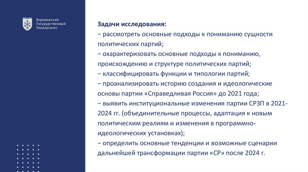 − выявить институциональные изменения партии СРЗП в 20212024 гг. (объединительные процессы, адаптация к новым