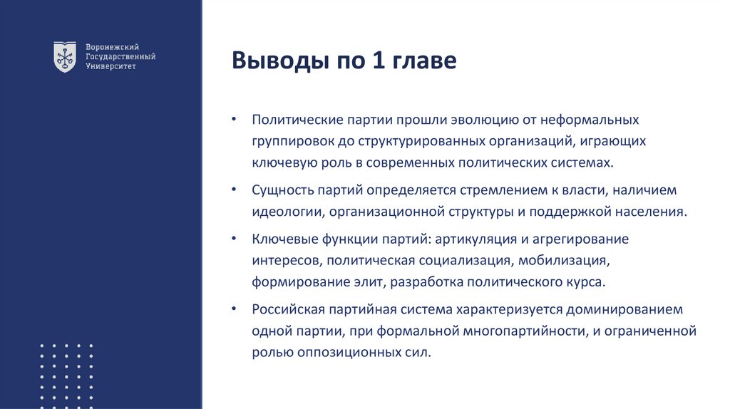 Выводы по 1 главе• Политические партии прошли эволюцию от неформальных