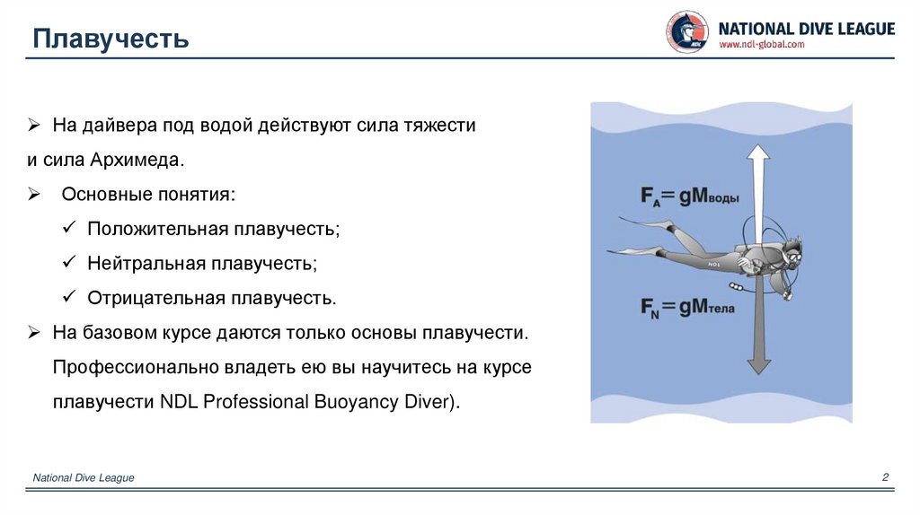 ПлавучестьНа дайвера под водой действуют сила тяжести