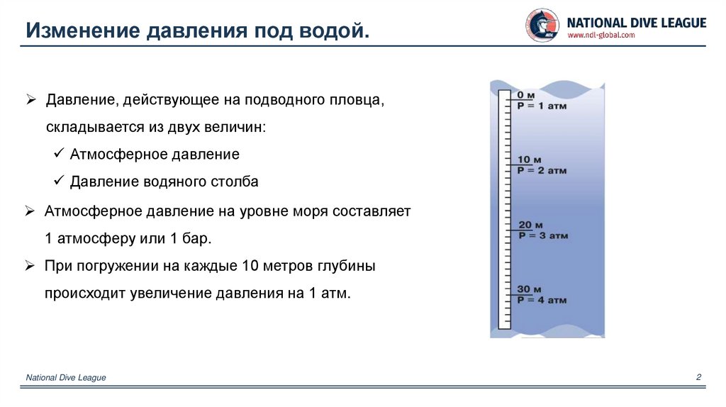 Изменение давления под водой.Давление, действующее на подводного пловца,