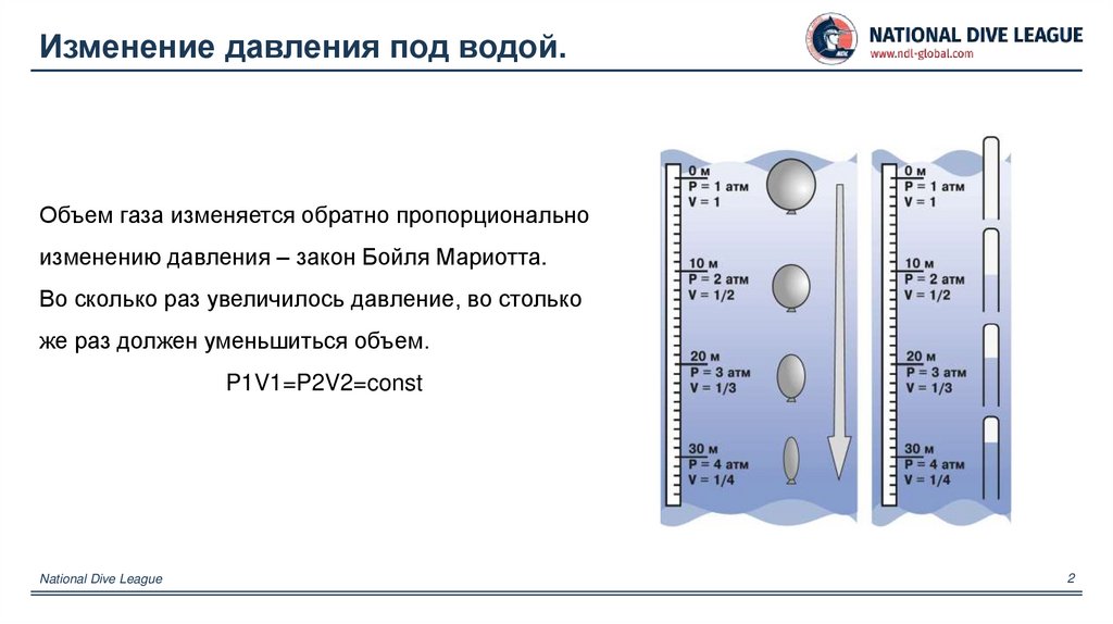 Изменение давления под водой.Объем газа изменяется обратно пропорционально