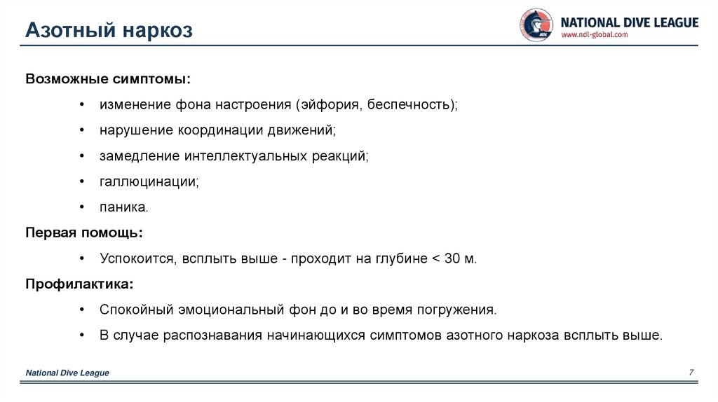 В случае распознавания начинающихся симптомов азотного наркоза всплыть выше.