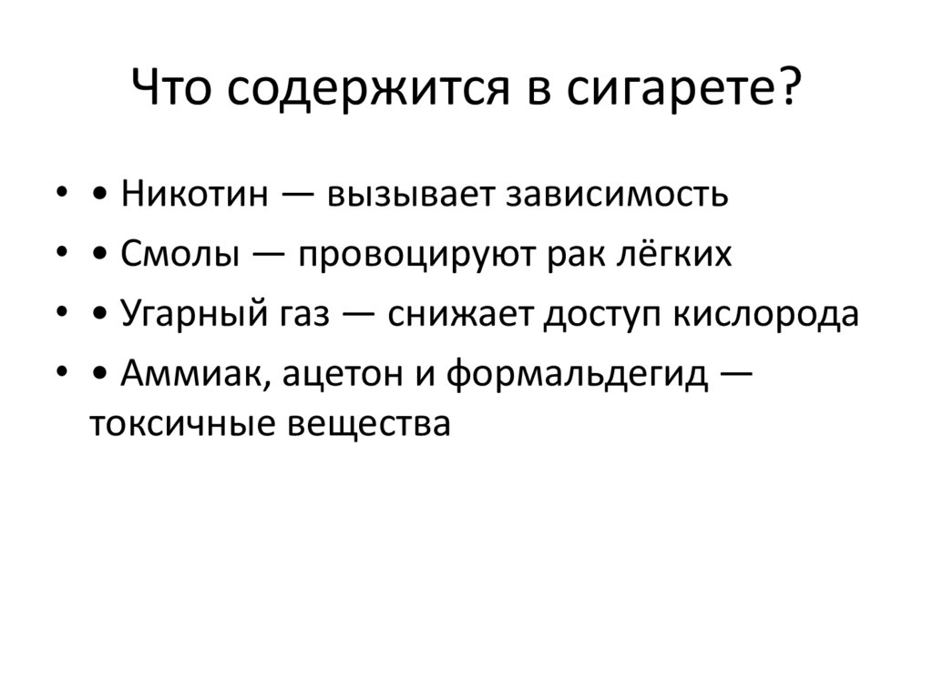 Что содержится в сигарете?• • Никотин — вызывает зависимость