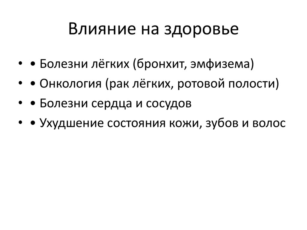 Влияние на здоровье• • Болезни лёгких (бронхит, эмфизема)