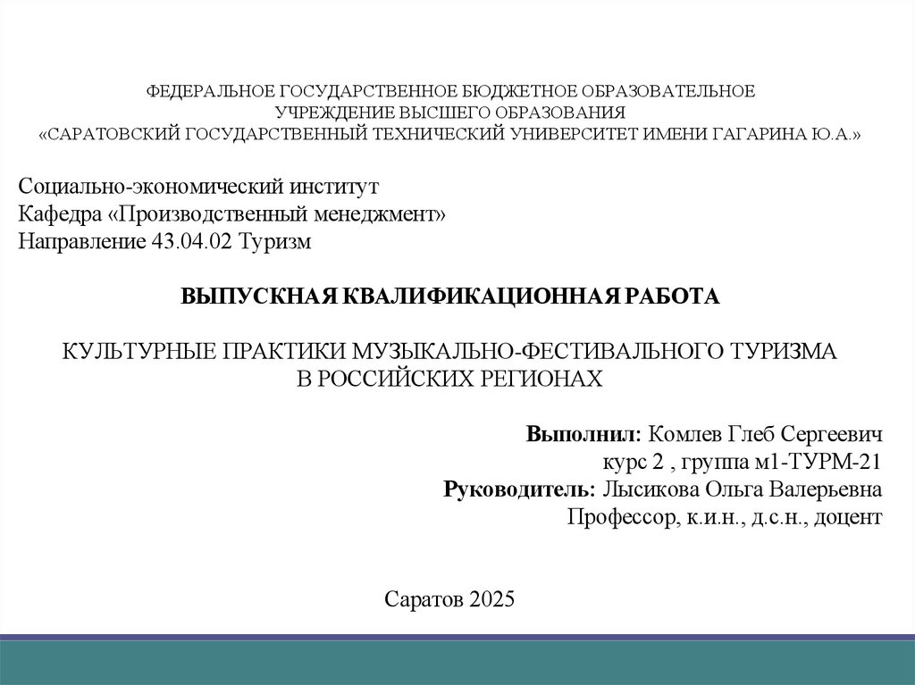 Выпускная квалификационная работа: культурные практики музыкально-фестивального туризма в российских регионах