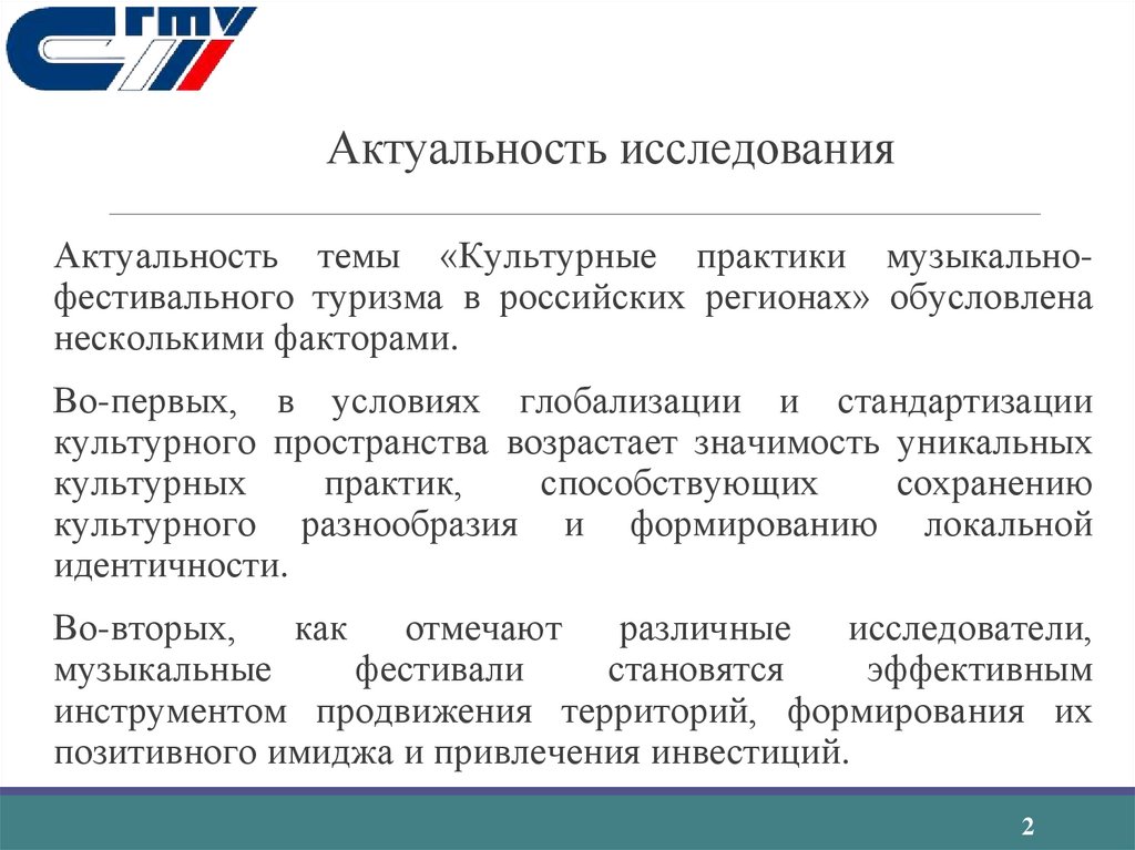 Актуальность исследованияАктуальность темы «Культурные практики музыкальнофестивального туризма в российских регионах» обусловлена