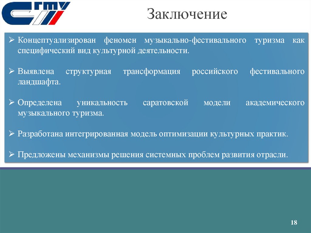 Заключение⮚ Концептуализирован феномен музыкально-фестивального туризма как