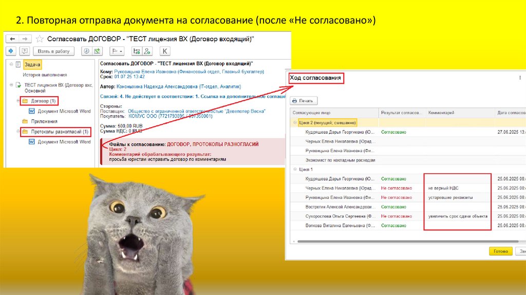 2. Повторная отправка документа на согласование (после «Не согласовано»)8. 5. «Согласовать» с комментарием – НЕЛЬЗЯ