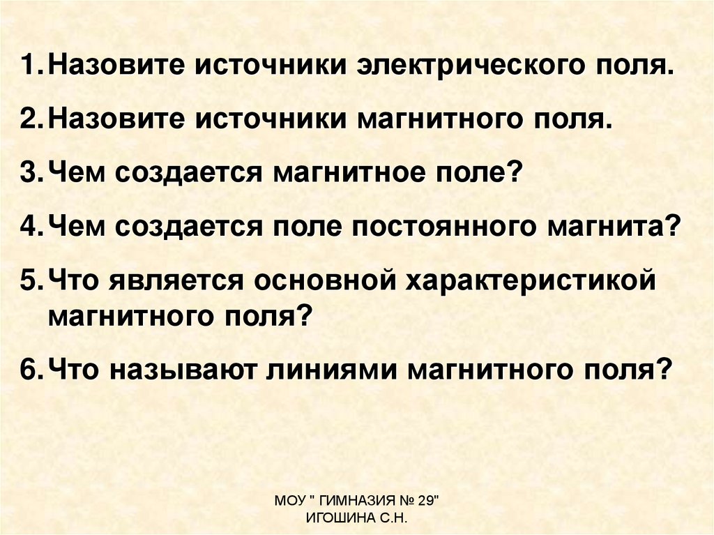1.Назовите источники электрического поля.2.Назовите источники магнитного поля.