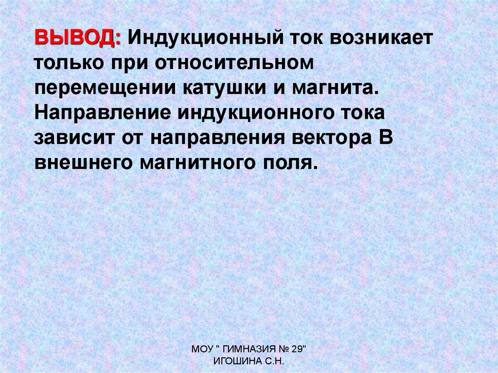 ВЫВОД: Индукционный ток возникаеттолько при относительном