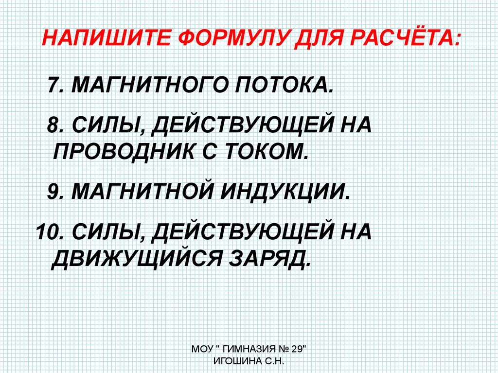 НАПИШИТЕ ФОРМУЛУ ДЛЯ РАСЧЁТА:7. МАГНИТНОГО ПОТОКА.