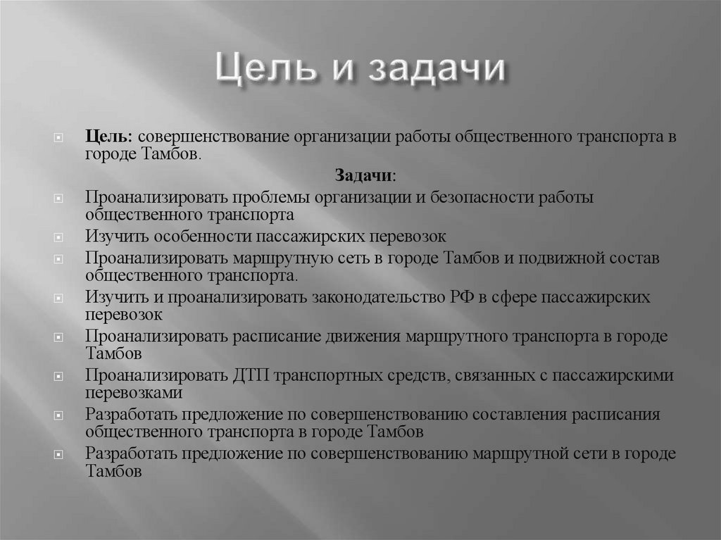Цель: совершенствование организации работы общественного транспорта вгороде Тамбов.