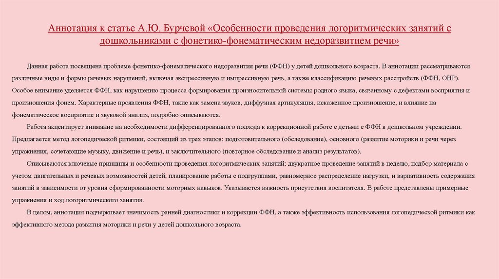 Аннотация к статье А.Ю. Бурчевой «Особенности проведения логоритмических занятий сдошкольниками с фонетико-фонематическим недоразвитием речи»